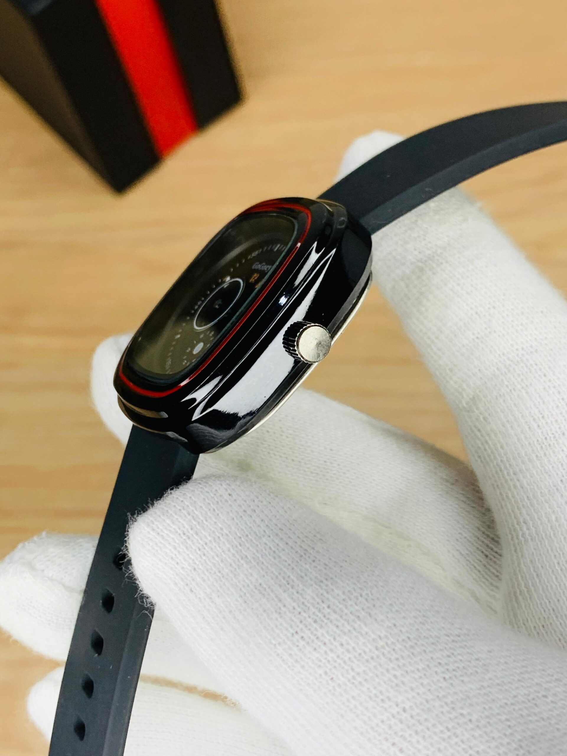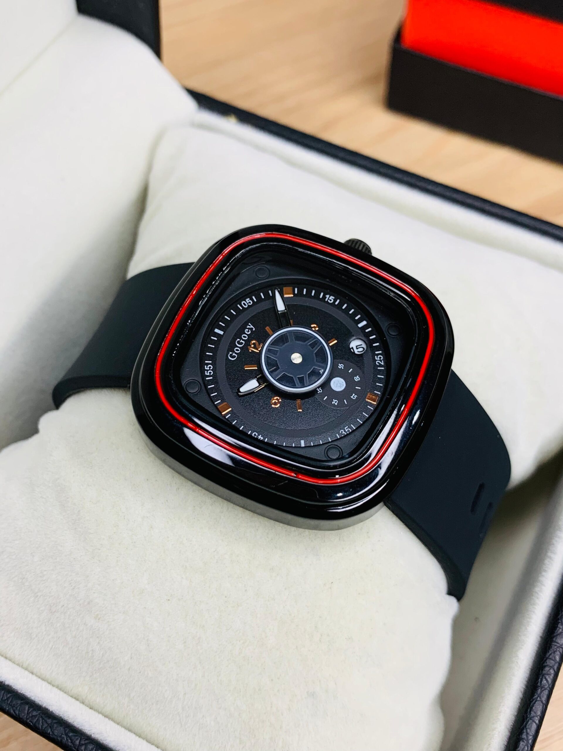 Elevate your style with this contemporary men’s watch featuring a distinctive square dial. The rich brown strap complements the sleek black and red-accented case, making it a versatile accessory for both casual and formal occasions.
